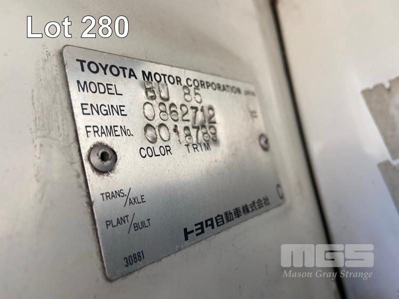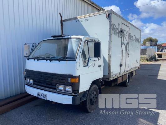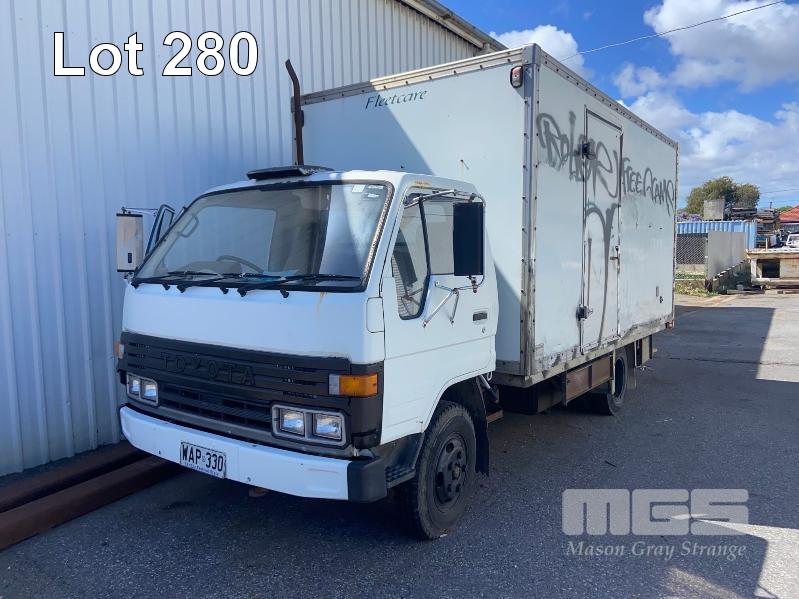1988 TOYOTA BU85 MAXI CUBE INSULATED TRUCK REG: WAP 330 VIN: BU850018789 ENG: 13B0862712 ODO: 233,933 kms SHOWING 5 SPEED MANUAL, DIESEL, 12 x 7 APPROX. NO BATTERIES ENGINE RUNS & DRIVES OK IGNITION ALL FAULTS INCLUDES CONTENTS OF HOUSEHOLD FURNITURE KEY #47 FOR DOORS (NO OWNER'S MANUAL, NO SERVICE BOOKS)