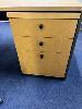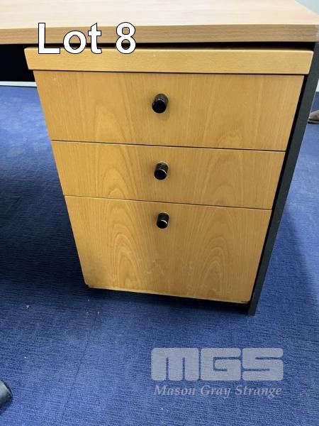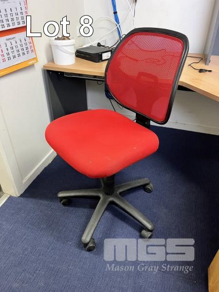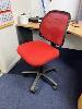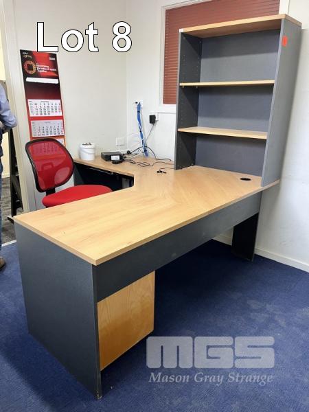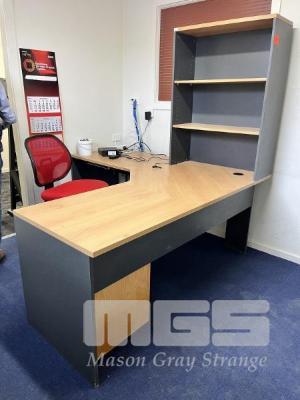 CHERRY & GREY LAMINATE L SHAPED OFFICE DESK, BOOKSHELF, 3 DRAWER PEDESTAL & RED FABRIC OFFICE CHAIR