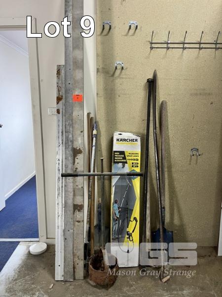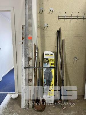 ASSORTED GARDEN TOOLS, CROW BARS, POST HOLE BORER, SHOVELS, SCREEDS, ETC