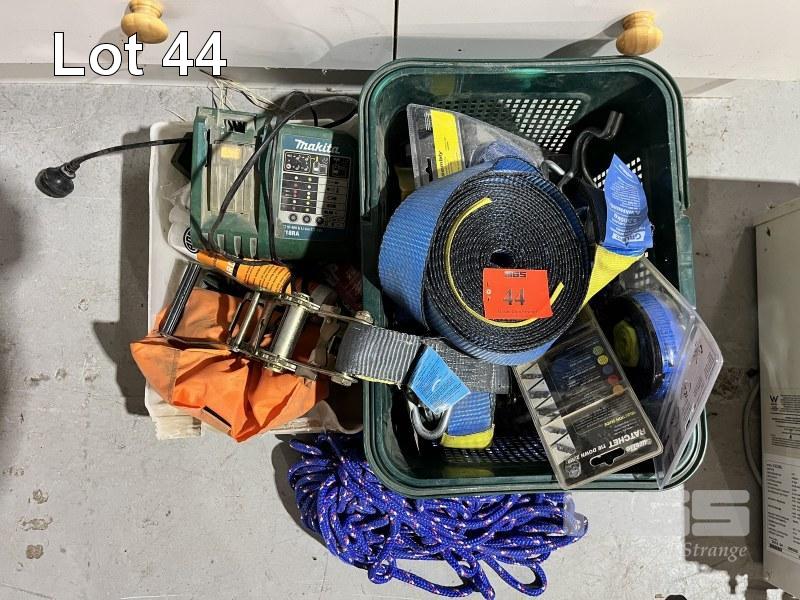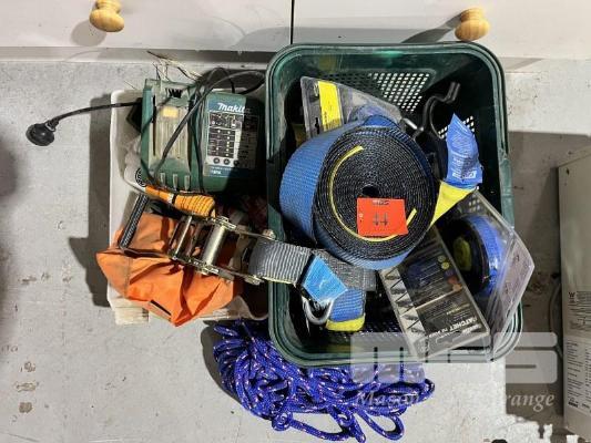 2 x PLASTIC BASKETS OF RATCHET TIE DOWN STRAPS & SUNDRIES