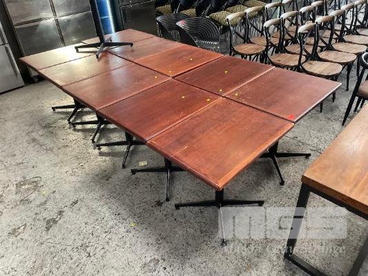 11 x TIMBER TOP CAFE TABLES, 800 x 600 x 720mm (H), BLACK STEEL PEDESTAL BASE, DARK STAIN SOLID TIMBER TOPS