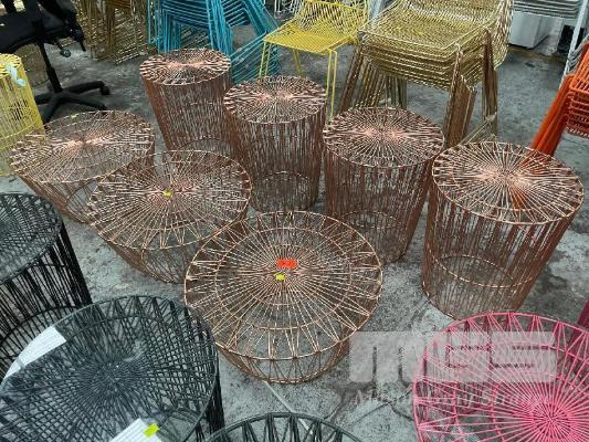 7 x OUTDOOR WIRE FRAME COFFEE TABLES, (NO GLASS), ROSE GOLD 4 @ 450mm (D) x 530mm (H) 3 @ 630mm (D) x 330mm (H)
