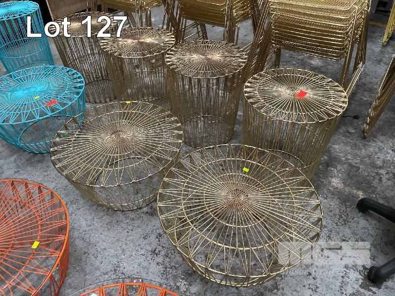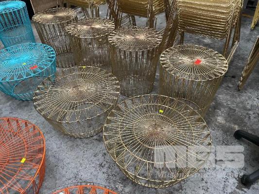 6 x OUTDOOR WIRE FRAME COFFEE TABLES, (NO GLASS), GOLD 4 @ 450mm (D) x 530mm (H) 2 @ 630mm (D) x 330mm (H)