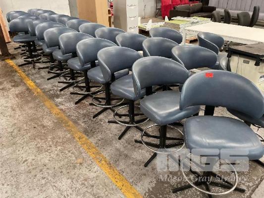 26 x BLUE VINYL BAR STOOLS, BLACK STEEL BASE, 600mm (H)
