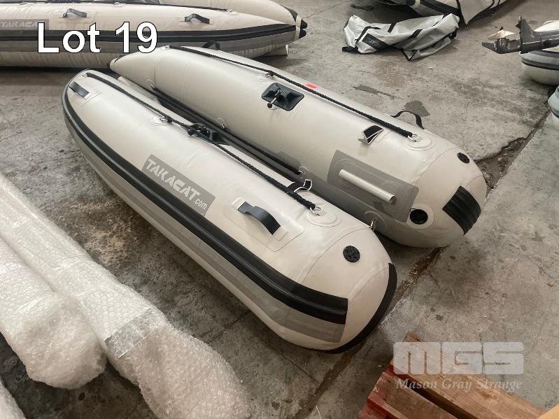 INFLATABLE BOAT, TAKACAT LENGTH: 2.4m NOTE: HAS SLOW LEAK IN PONTOON, NO BACKBOARD, BRACE POLES OR INFLATABLE BASE