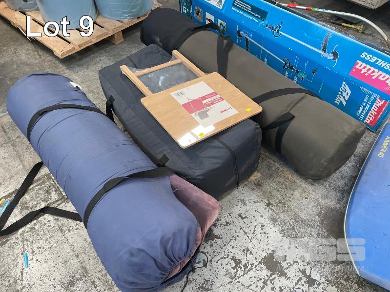 3 x ASSORTED INFLATABLE MATTRESSES, TIMBER CAMP TABLE