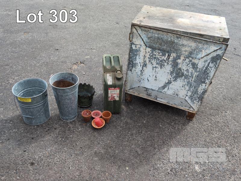 1 X VINTAGE FALABLES CUPBOARD, JERRYCAN & GALV BUCKETS