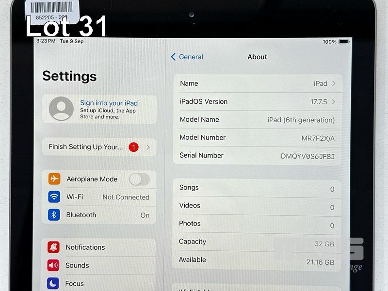 APPLE iPAD 6TH GEN, 32GB, Wi-Fi, SPACE GREY, MODEL MR7F2X/A, A1893 (NO CHARGER, NO CABLE) (NOTE: MINOR SCRATCHES ON SCREEN) S/N:DMQYV0S6JF8J