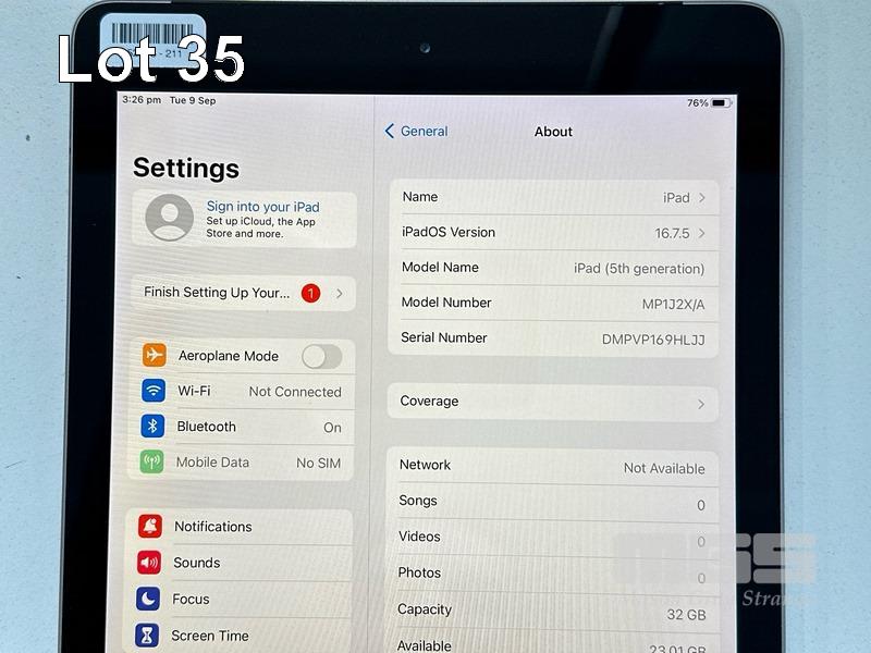 APPLE iPAD 5TH GEN, 32GB, Wi-Fi, CELLULAR, SPACE GREY, MODEL MP1J2X/A, A1823 (NO CABLE, NO CHARGER) S/N:DMPVP169HLJJ
