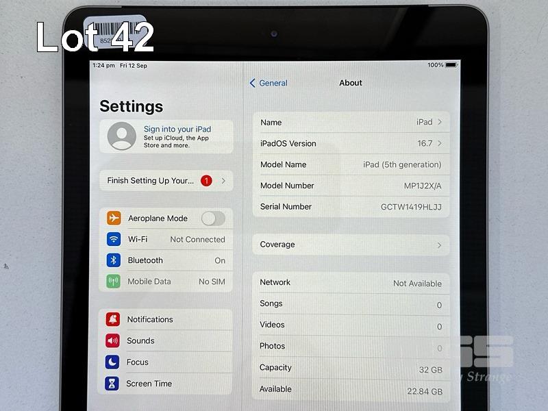 APPLE iPAD 5TH GEN, 32GB, Wi-Fi, CELLULAR, SPACE GREY, MODEL MP1J2X/A, A1823 (NO CABLE, NO CHARGER) S/N:GCTW1419HLJJ