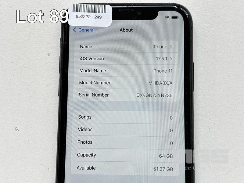 APPLE iPHONE 11, 64GB, MODEL MHDA3X/A, A2221, BLACK, BATTERY HEALTH 85% (NO CABLE, NO CHARGER) (NOTE: MINOR SCRATCHES ON SCREEN) S/N:DX4GN73YN735