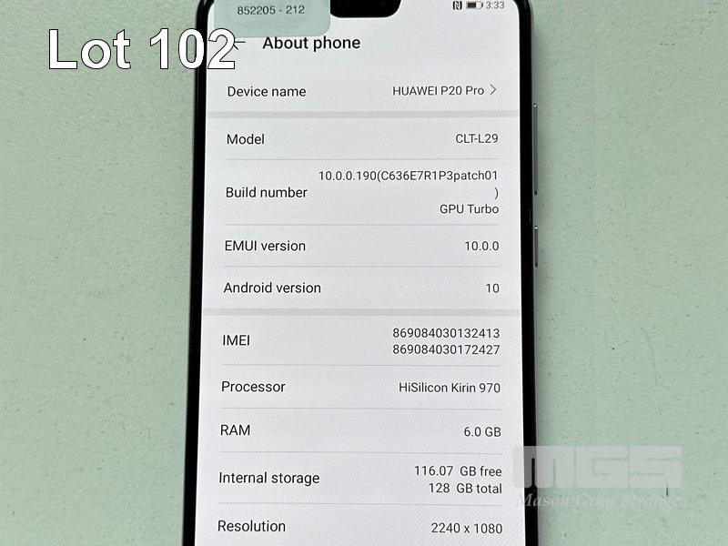 HUAWEI P20 PRO ANDROID SMARTPHONE, 128GB, MODEL CLT-L29 (NO CABLE, NO CHARGER) (NOTE: MINOR SCRATCHES ON SCREEN) S/N:WCR7N18428004060
