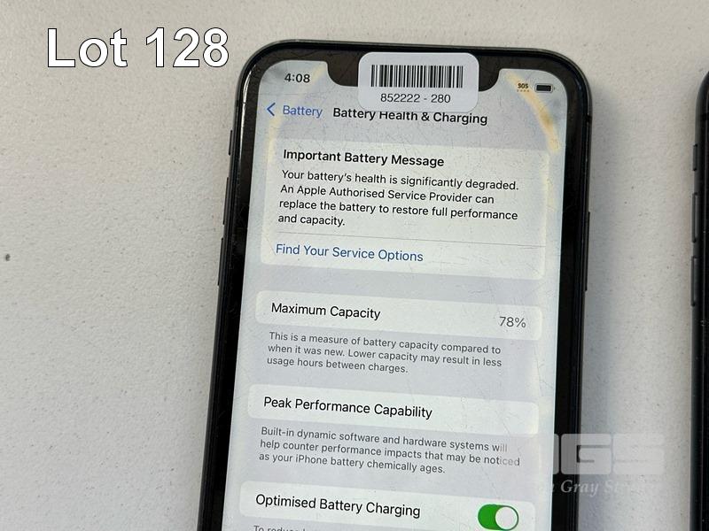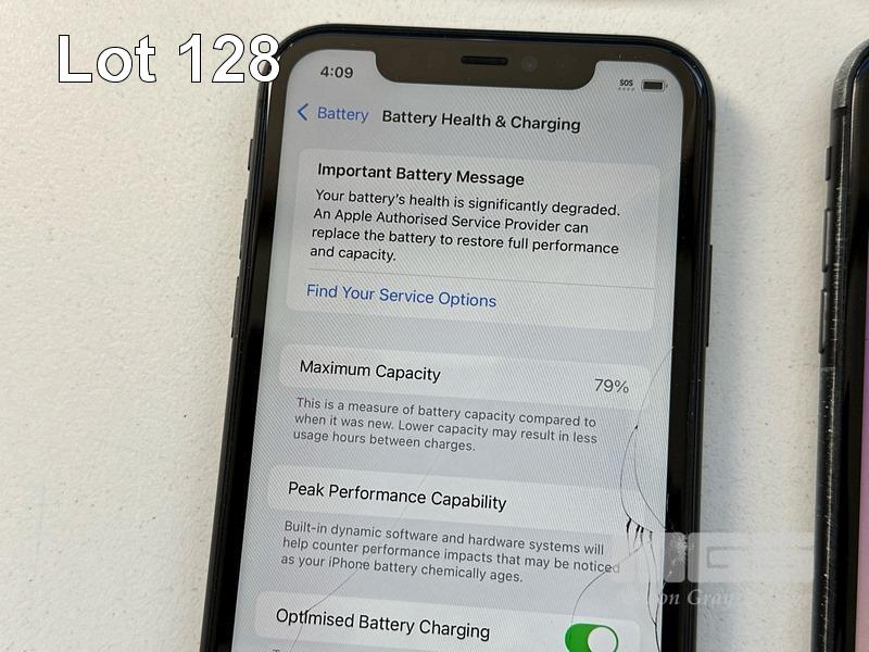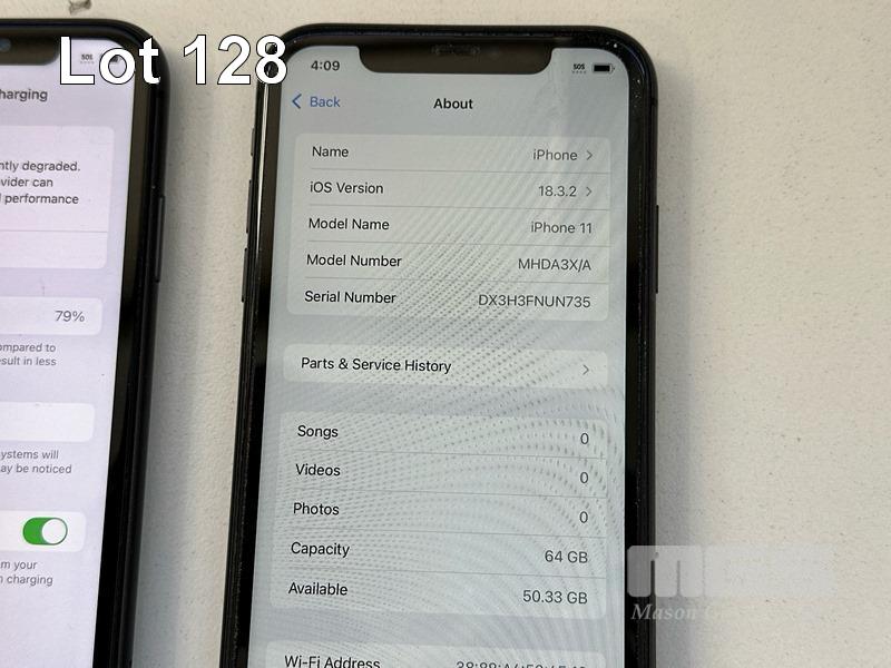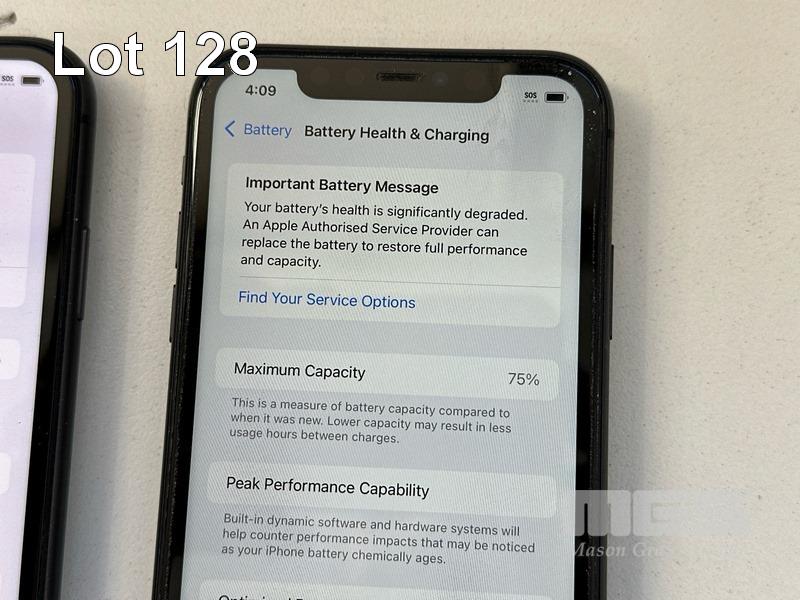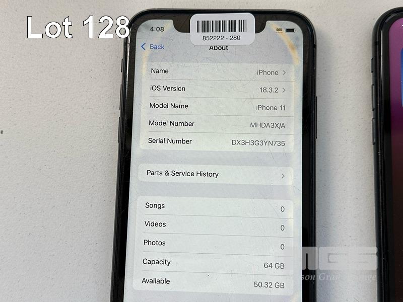 6 x APPLE iPHONE 11 INC. - 1 x iPHONE 11, 64GB, MODEL MHDA3X/A, A2221, BLACK, 78% (NOTE: SCREEN FAULT) - 1 x iPHONE 11, 64GB, MODEL MHDA3X/A, A2221, BLACK, 79% (NOTE: DISPLAY ERROR MESSAGE) - 1 x iPHONE 11, 64GB, MODEL MHDA3X/A, A2221, BLACK, 75% (NOTE: FACE ID ISSUE DETECTED) - 1 x iPHONE 11, 64GB, MODEL MHDA3X/A, A2221, BLACK, 79% (NOTE: DAMAGED) - 1 x iPHONE 11, 64GB, MODEL MHDA3X/A, A2221, BLACK, 85% (NOTE: CHARGING PORT ISSUE) - 1 x iPHONE 11, 64GB, MODEL MHDA3X/A, A2221, BLACK, 76% (NOTE: DAMAGED) (NOTE: ALL BATTERY SERVICE MESSAGES) (NO CABLES, NO CHARGERS) S/N:DX3H3G3YN735, DX3H3G7DN735, DX3H3FNUN735, DX3H3SKCN735, DX3G8BY0N735, DX3H3FUBN735