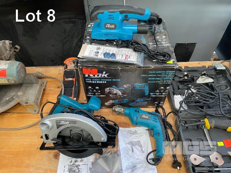 ROK POWER TOOLS INCLUDING, CIRCULAR SAW, 185mm, IMPACT DRILL, 13mm, ORBITAL SANDER, 150w, AS NEW WITH BOOKLETS & OUTDOOR POWER BOARD