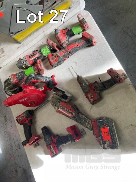 MILWAUKEE POWER TOOLS, 18V INCLUDING, ANGLE GRINDER, MOD: M18FAG125XPD WITH 12.0AH BATTERY, 2 x DRILLS, MOD: M18FPD2 & M18FPD3 BLOWER MOD: M18BBL & 3 x ANGLE GRINDERS & TEK GUN ALL FAULTS MARKED GREEN NO CHARGER