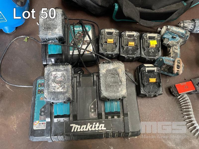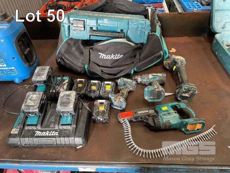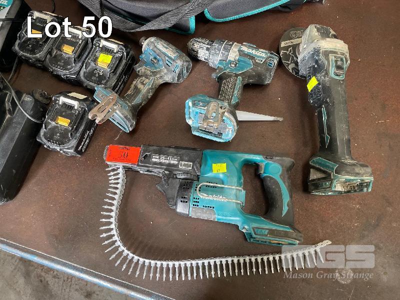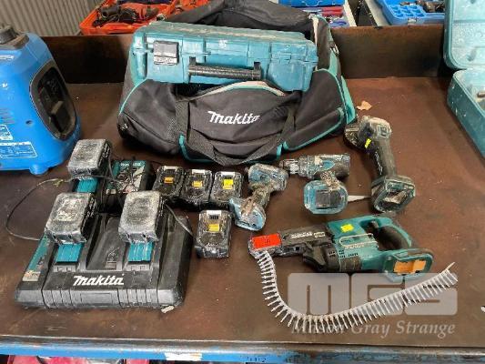 MAKITA POWER TOOLS INCLUDING SCREW GUN MOD: FR450X, ANGLE GRINDER MOD: DGA450X, DRILL MOD: DHP484, TEK GUN MOD: DTD172, 4 x 5.0AH BATTERIES, 1 x 6.0AH BATTERY, 2 x 3.0AH BATTERIES, 2 x CHARGERS & CARRY BAG