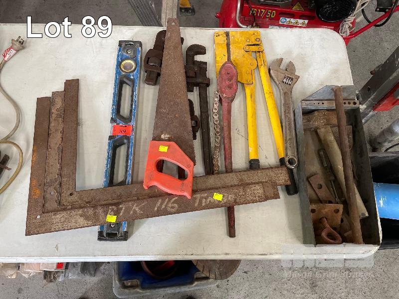 ASSORTED HAND TOOLS, SET SQUARES, PIPE WRENCHES, CHAIN WRENCH, SPIRIT LEVEL, SHIFTER ETC.