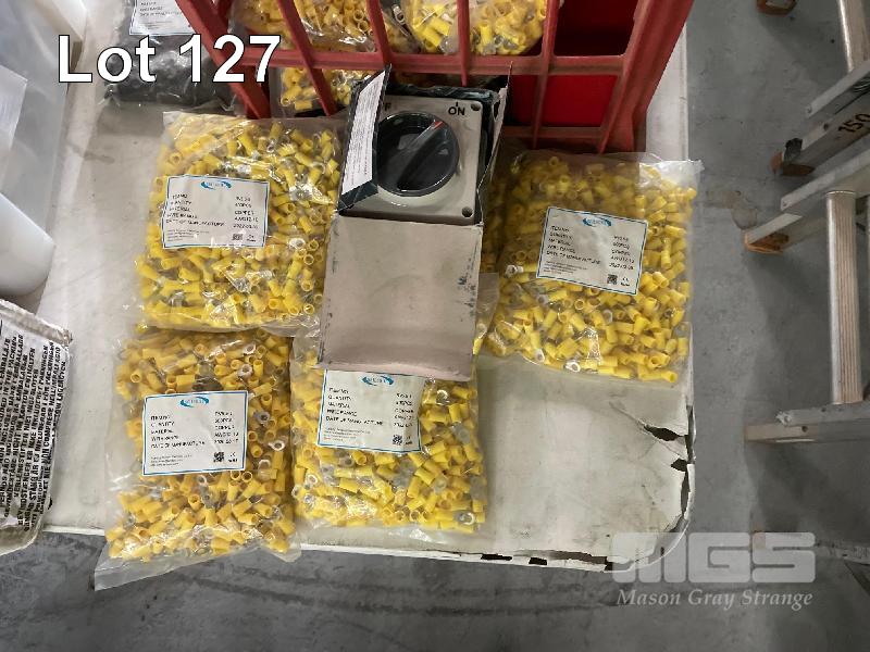 LARGE QUANTITY ELECTRICAL COMPONENTS, TERMINAL LUGS, GLOBES, CONDUIT ELBOWS, ISOLATION SWITCHES CONTENTS OF TABLE
