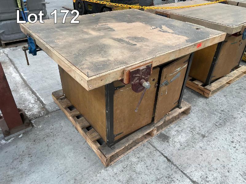 TIMBER WORK BENCH, 1250 x 1400 x 830mm (H), WITH DAWN VICE, 175mm & CLAMP VICE, 175mm, WITH UNDER BENCH STORAGE