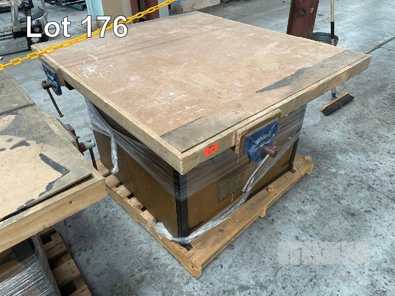 TIMBER WORK BENCH, 1250 x 1400 x 830mm (H), WITH 3 x DAWN VICES, 175mm WITH UNDER BENCH STORAGE