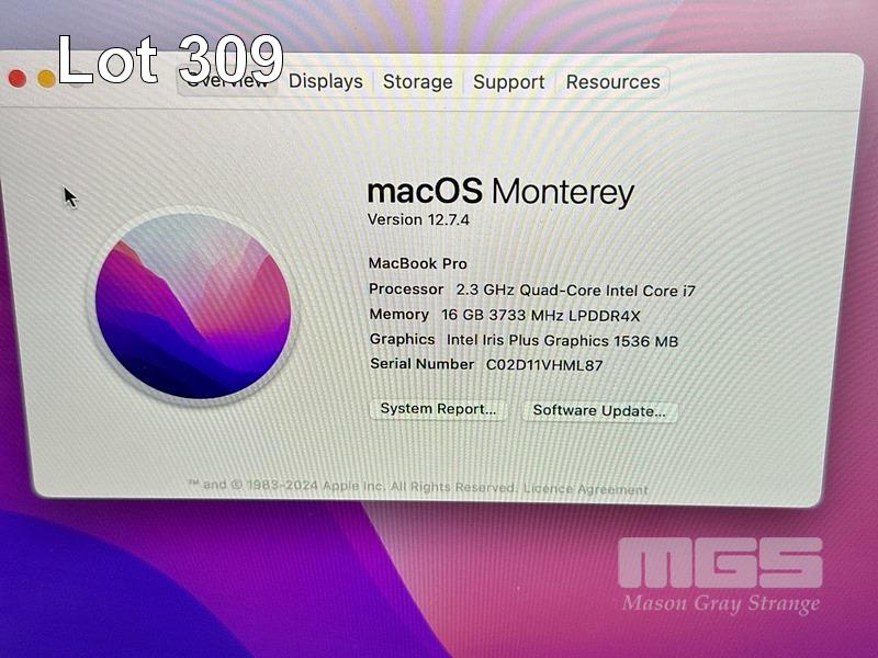 LAPTOP, APPLE MACBOOK PRO (A2251), CORE i7 1068NG7 (10TH GEN) @ 2.3GHz, 16GB DDR4 RAM, 1TB SSD, 13.3" RETINA DISPLAY (2560x1600), INTEL IRIS PLUS GRAPHICS, Wi-Fi, BLUETOOTH, MAC OS 12 INSTALLED (NO USB-C POWER SUPPLY) (NOTE: MINOR DAMAGE TO CASING) S/N:C02D11VHML87