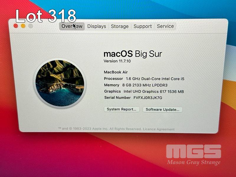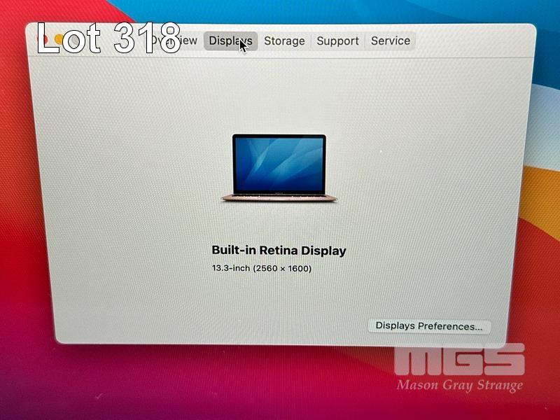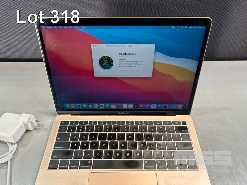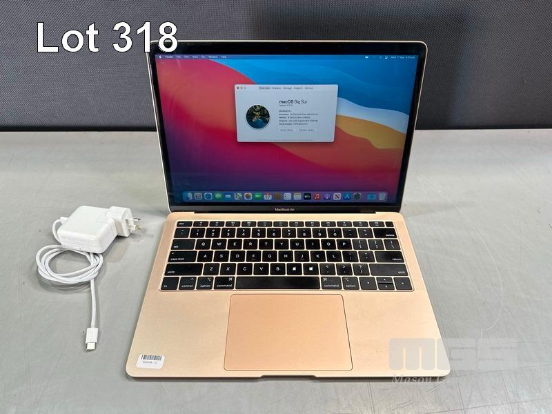 LAPTOP, APPLE MACBOOK AIR (A1932) (GOLD), CORE i5 8210Y (8TH GEN) @ 1.6GHz, 8GB DDR3 RAM, 256GB SSD, 13.3" RETINA DISPLAY (2560x1600), INTEL UHD GRAPHICS 617, Wi-Fi, BLUETOOTH, MAC OS 11 INSTALLED & USB-C POWER SUPPLY (30W) (NOTE: 2 x KEYS WORN, MINOR MARKS ON SCREEN) S/N:FVFXJ0R3JK7G