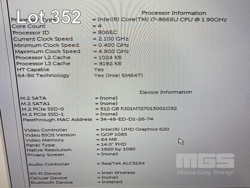 LAPTOP, DELL LATITUDE 7400, CORE i7 8665U (8TH GEN) @ 1.9GHz, 16GB DDR4 RAM, 512GB NVMe M.2 SSD, 14" WIDESCREEN (1920x1080), INTEL UHD GRAPHICS 620, Wi-Fi, BLUETOOTH, WINDOWS 11 PRO INSTALLED & POWER SUPPLY (NOTE: BATTERY NOT HOLDING CHARGE, RUBBER PADS MISSING ON BOTTOM OF LAPTOP, MARKS ON SCREEN) S/N:41QB733