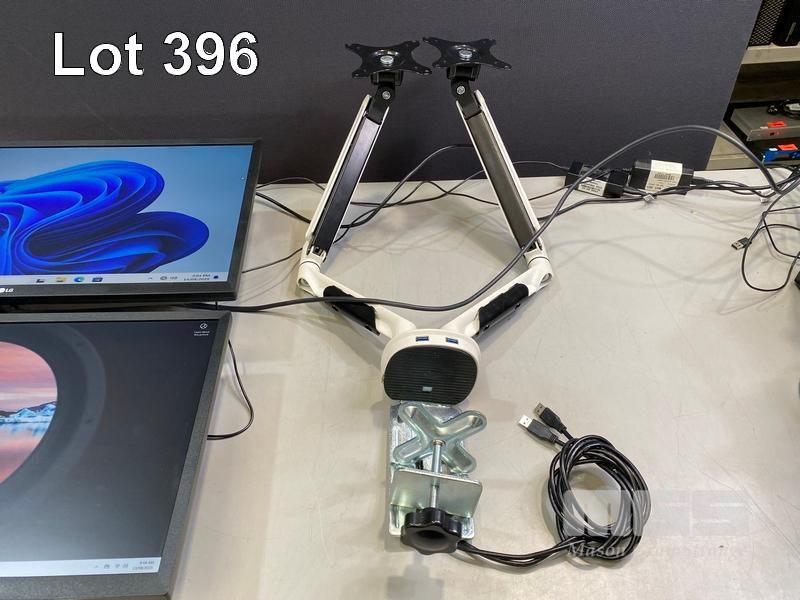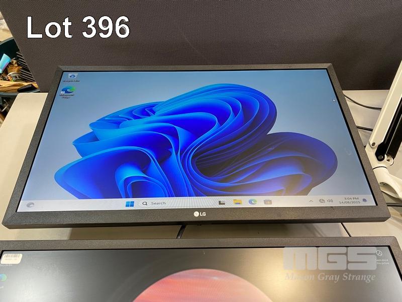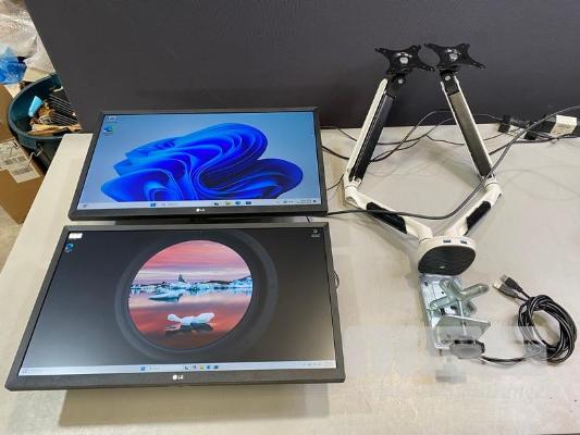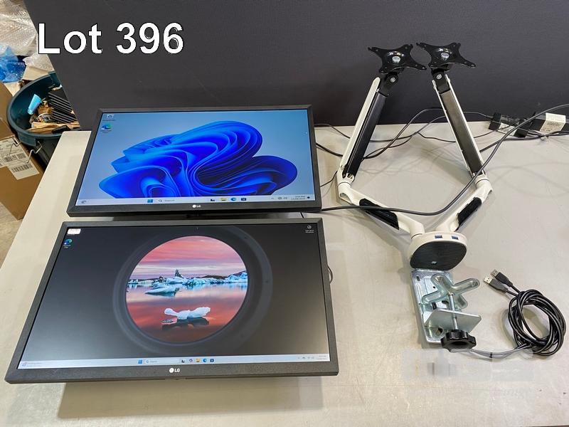 2 x MONITORS, LG 24" FHD IPS LED WIDESCREEN, 24MK430H, HDMI, VGA (WITH CABLES) WITH DUAL DESK MOUNT MONITOR ARM, WHITE (NOTE: SMALL SCRATCH ON 1 x MONITOR) S/N:112NTQDFE164, 112NTYTFD570