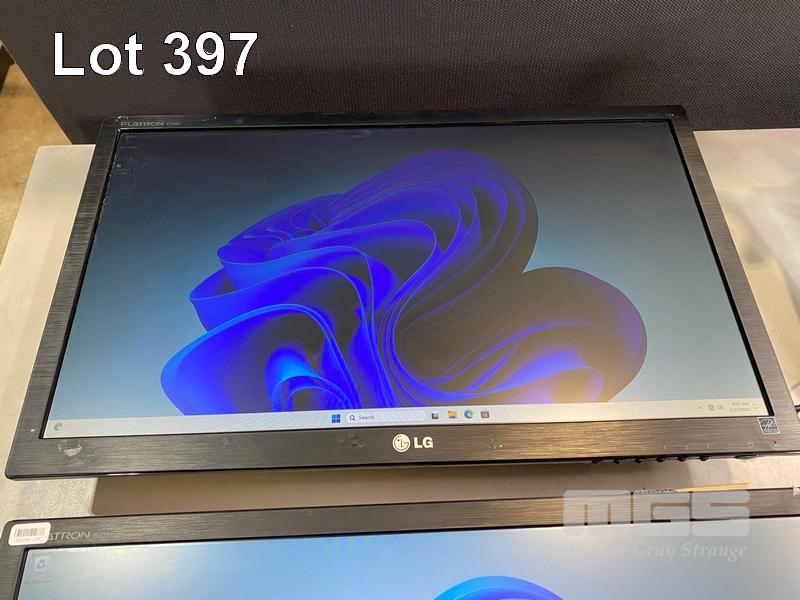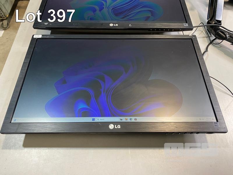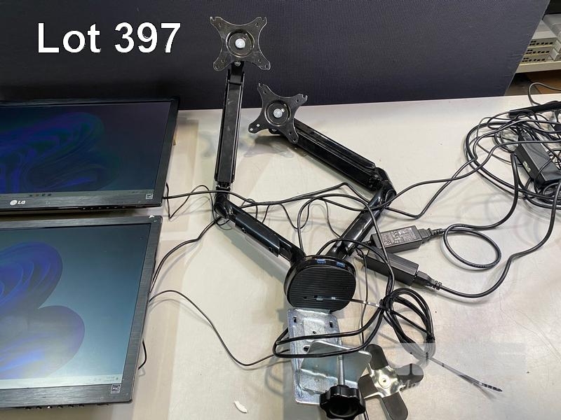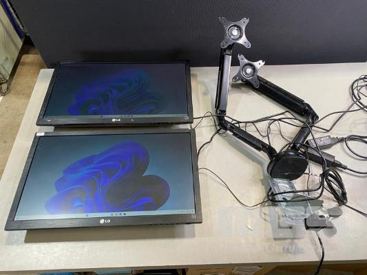 2 x MONITORS, LG FLATRON E2351 23" LCD WIDESCREEN, HDMI, VGA, DVI (WITH CABLES) WITH DUAL DESK MOUNT MONITOR ARM, BLACK