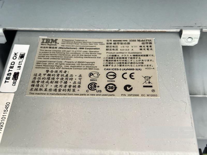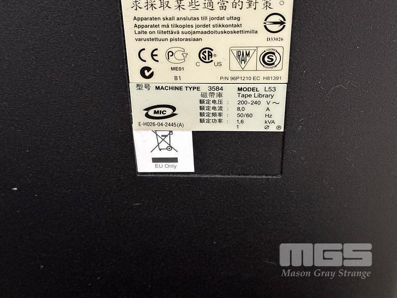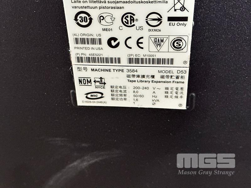 TAPE LIBRARY, IBM SYSTEM STORAGE, T3500, TYPE 3584, MODEL L53 (BASE FRAME), - COMPRISING 12 x TAPE DRIVES, LTO4, FC SHORT-WAVE, TYPE 3588-F4A WITH IBM TYPE 3584 MODEL D53 EXPANSION FRAME, - COMPRISING 8 x (SPARE) TAPE DRIVES, LTO4, FC SHORT-WAVE, TYPE 3588-F4A WITH KEYS & MANUAL, EACH FRAME IS 180cm x 120cm x 80cm ON CASTORS S/N: 7821338, 7846097