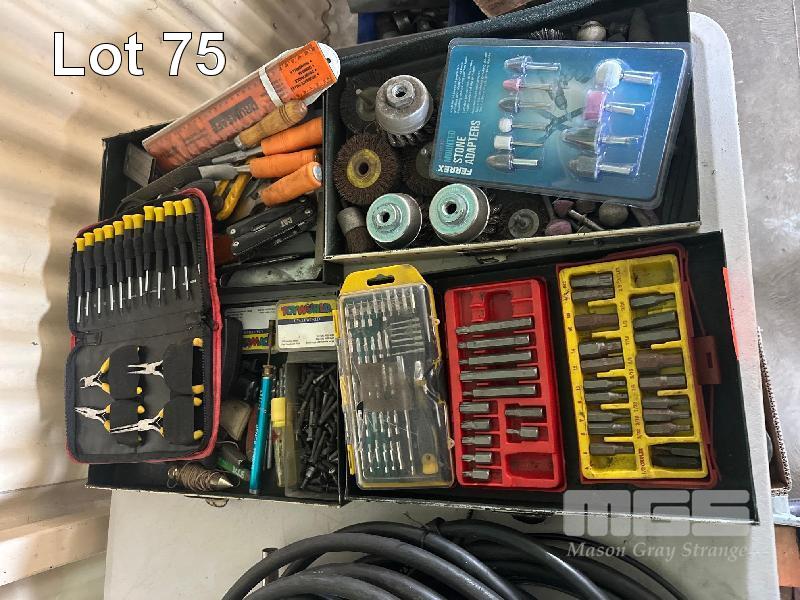WIRE BRUSHES, TEK BITS, PIN PUNCH SET, CHISELS, STONES, 1 x TRAY