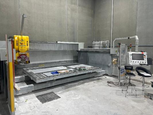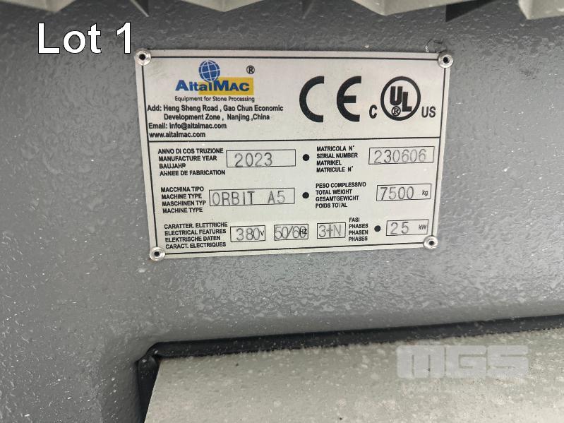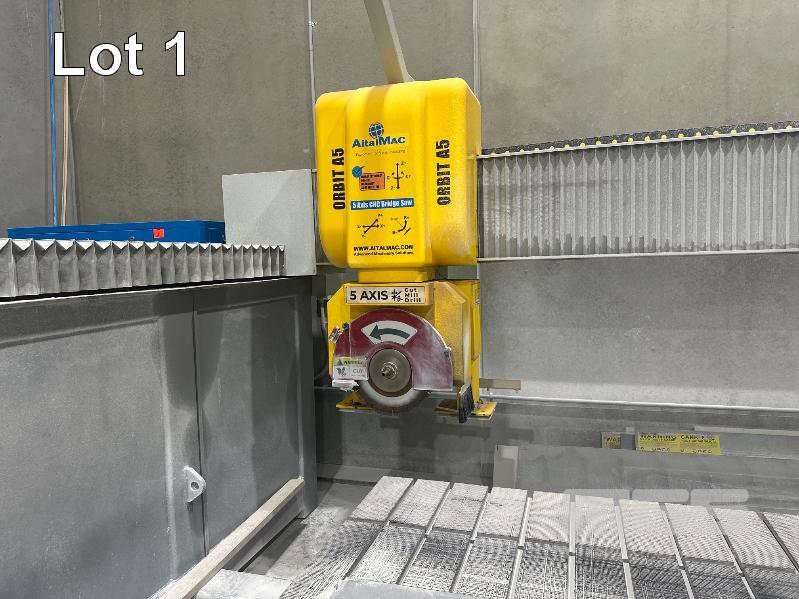 AITAL-MAC CNC BRIDGE SAW MOD: ORBIT-A5 DOM: 2023 5 AXIS, 415V HARD WIRED 3600 x 2400mm CUTTING TABLE CONSUL CNC CONTROLLER WITH REMOTE FRONT DOOR PANELS REMOVED ELECTRIC EYE GUARDING + CIRCULATING FLUID PUMP, 2 x IBCS EDGE GRINDING DISCS & SPARE BLADES