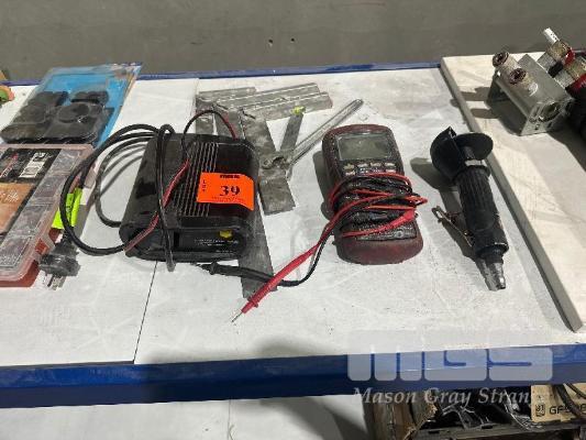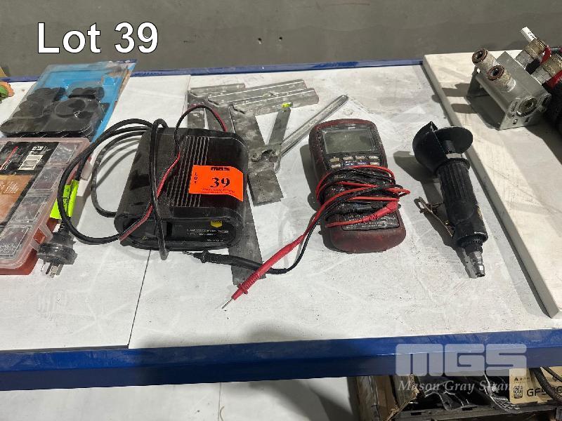 MULTI METER, AIR DISC GRINDER, BATTERY CHARGER, SET SQUARE, LEVELS, SPRAY BOTTLES, AIR MANIFOLD, ETC