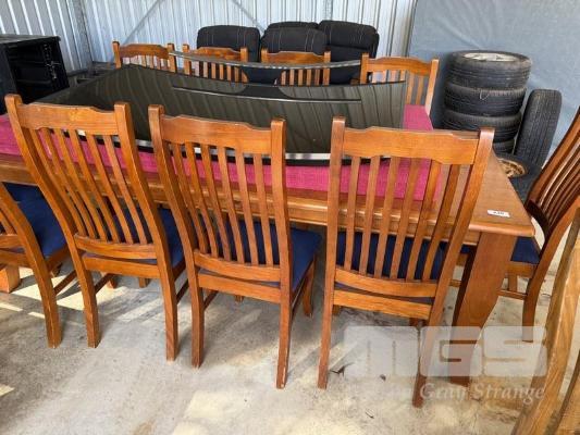 STAINED TIMBER DINING SUITE, TABLE & 10 x CHAIRS