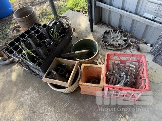 ASSORTED PLANTER TUBS, BASKETBALL RING, ETC