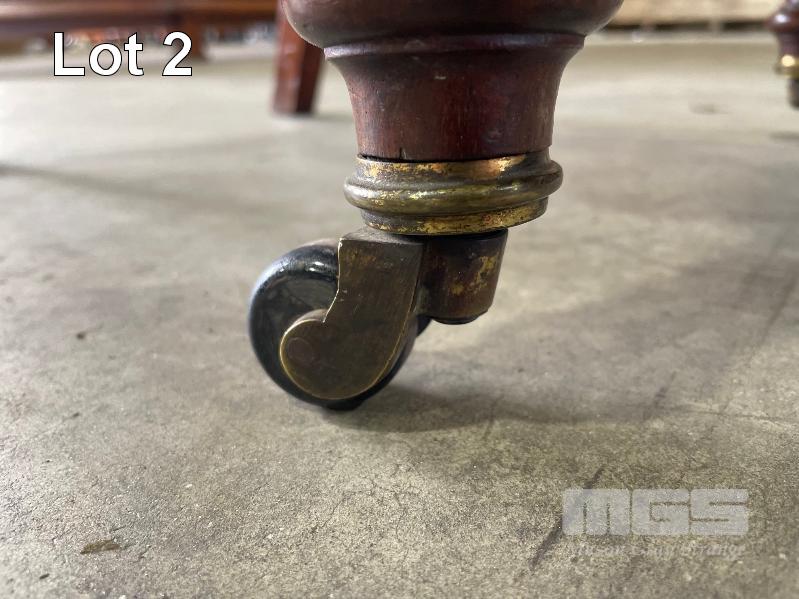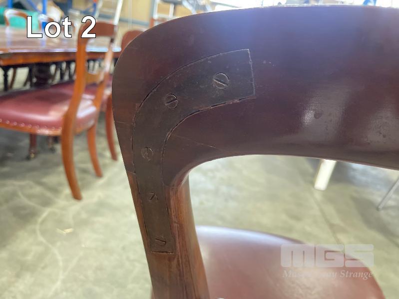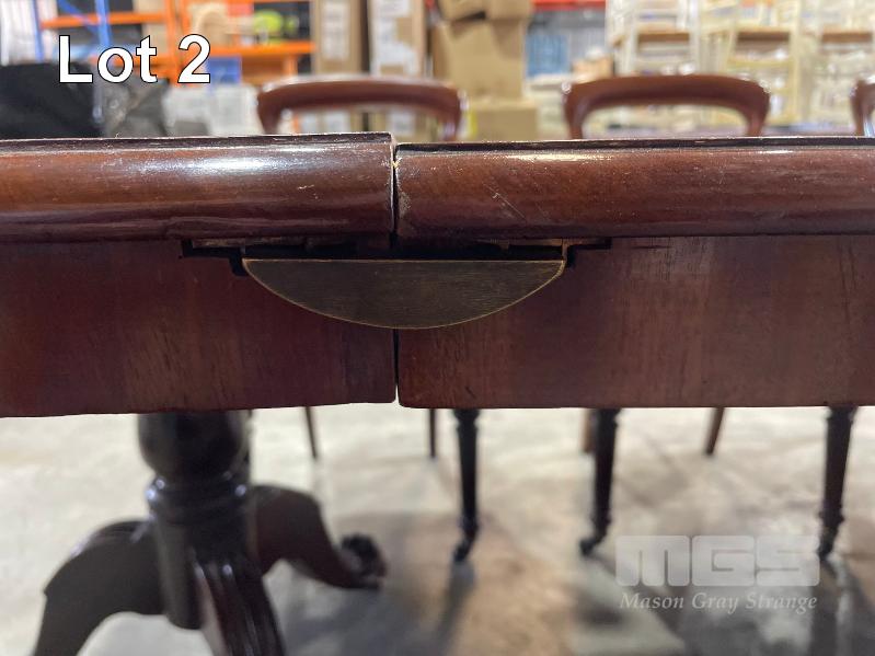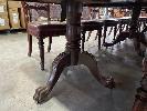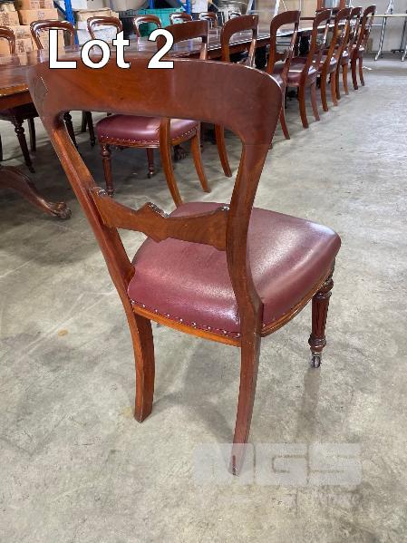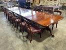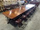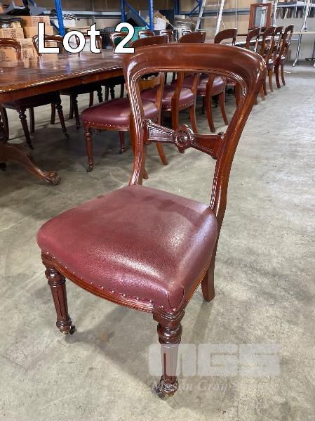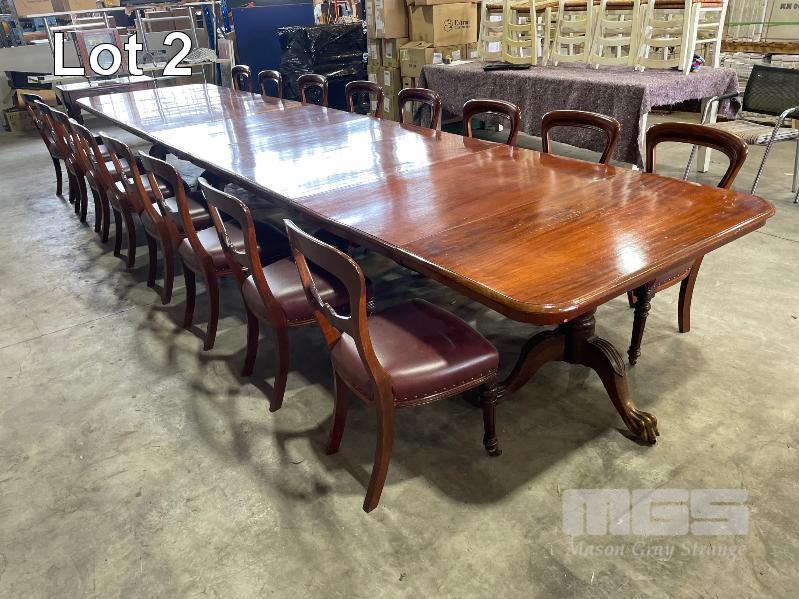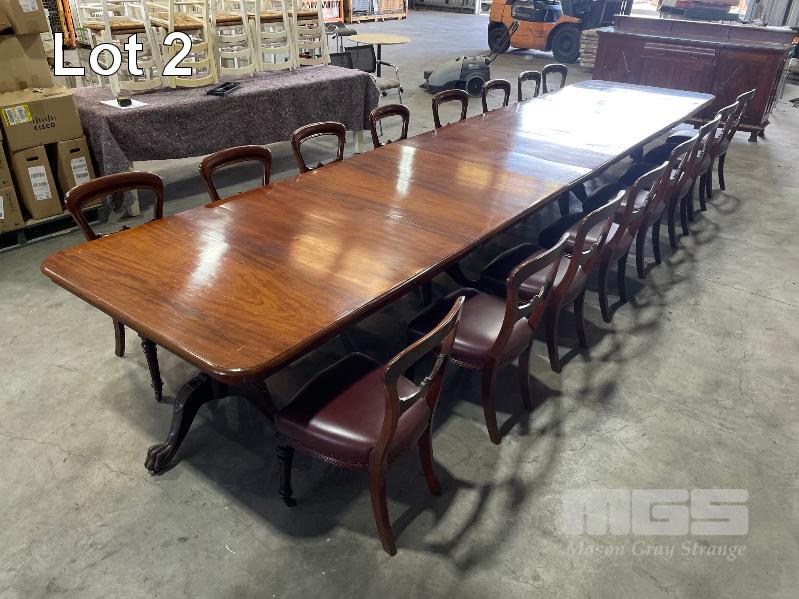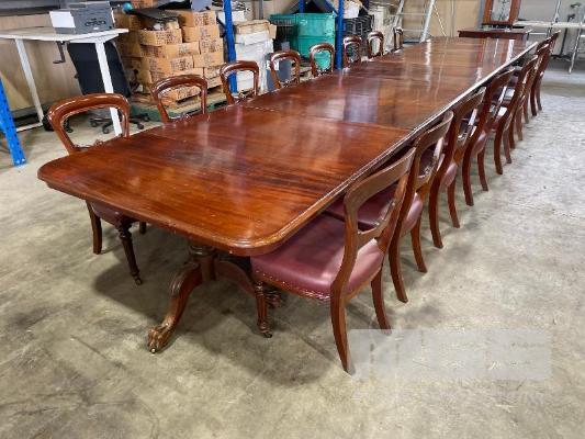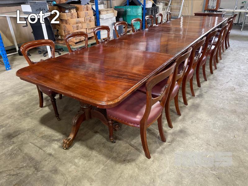 VICTORIAN MAHOGANY 4 SECTION TABLE, 5550 x 1250 x 730mm (H) WITH BRASS SECTION LOCKS (PHOTOGRAPHED) CLAW & BALL PEDESTAL SECTION BASES WITH BRASS SWIVEL WHEELS, VARIOUS MINOR DAMAGE REFLECTIVE OF AGE WITH SET OF 16 LATE VICTORIAN STYLE UPHOLSTERED DINING CHAIRS TURNED FRONT LEGS WITH BRASS & PORCELAIN CASTORS, LEATHER UPHOLSTERY (SOME REPAIRS HAVE BEEN UNDERTAKEN BUT IN OVERALL GOOD CONDITION