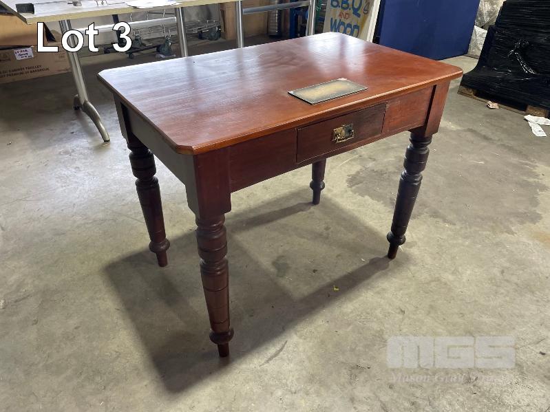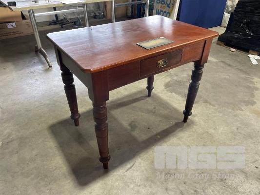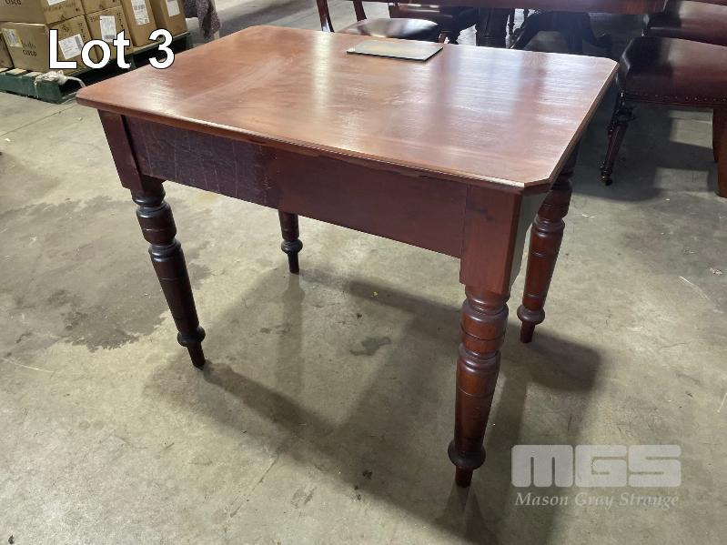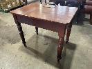 LATE VICTORIAN WRITING TABLE 915 x 590 x 750mm, SINGLE DRAWER, BRASS DRAWPULL, TURNED LEGS NOT ORIGINAL TOP MINOR WEAR, OVERALL GOOD CONDITION FOR AGE