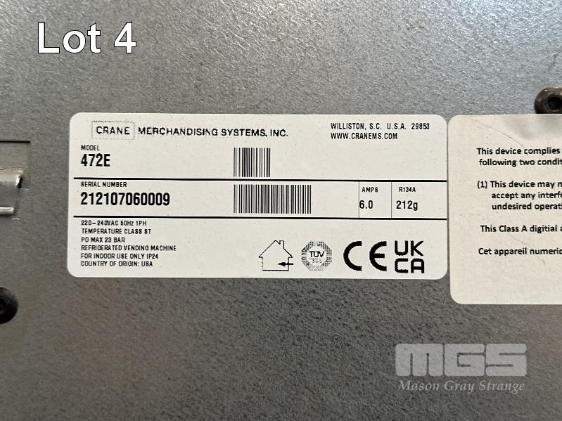 CRANE COMBINATION SNACK & BEVERAGE VENDING MACHINE, MOD: 472E REFRIGERATED, 44 TOTAL SELECTIONS, ACCEPTS COINS, NOTES & PAYWAVE PAYMENTS 9″ TOUCHSCREEN USER PANEL, WITH ON SCREEN ADVERTISING VIDEOS AND CART PURCHASING, LED PIL LIGHTING ON THE USER PANEL MULTI-PRODUCT PURCHASES MADE IN USA, 240V 10 AMP WITH KEY RRP: $11,000 USD