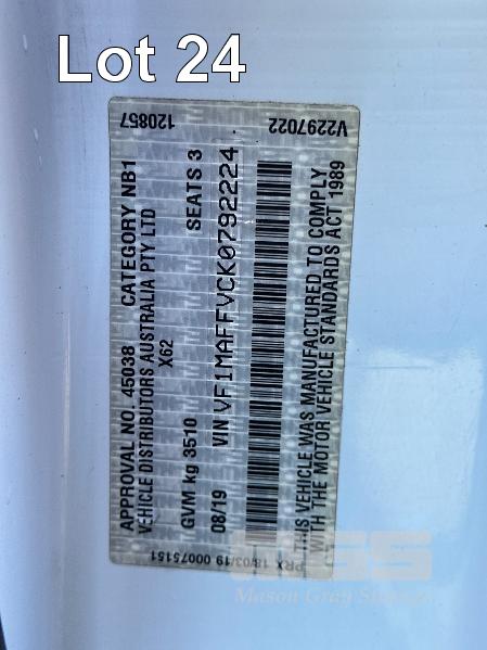 2019 RENAULT MASTER ELWB HIGH REFRIGERATED VAN REG: XB 867Y (SA) (EXPIRED) VIN: VF1MAFFVCK0792224 ODO: 110,617 2.3L, 6 SPEED AUTOMATED MANUAL, TURBO DIESEL, WHITE, 3 DOORS, 3 SEAT, REFRIGERATION UNIT, TRANZ FREEZ MODEL:35N4 DOM: 29/04/2020 S/NO. 12613 REAR SHELVING BARN DOORS NOTE: VARIOUS DENTS & EXTERIOR DAMAGE REFER PHOTOS KEY #1 (WITH 1 KEY/S)