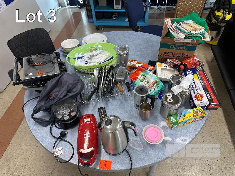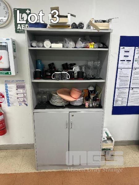 CIRCULAR LUNCH ROOM TABLE, 1500mm (D) WITH CONTENTS KITCHEN SUNDRIES + TIMBER LAMINATE CUPBOARD, 1800 x 900 x 400mm (NOT THE CONTENTS)