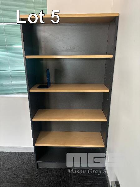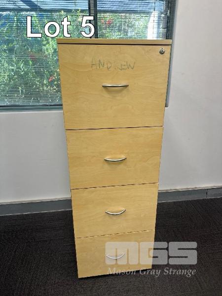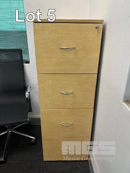 OFFICE SET, STAND UP CORNER DESK, TIMBER LAMINATE, 1800 x 1800 x 1020mm (H), WITH PARTITIONS, 2 x 4 DRAWER FILING CABINETS, 1320mm (H), MATCHING BOOK SHELF, 1800 x 900 x 300mm