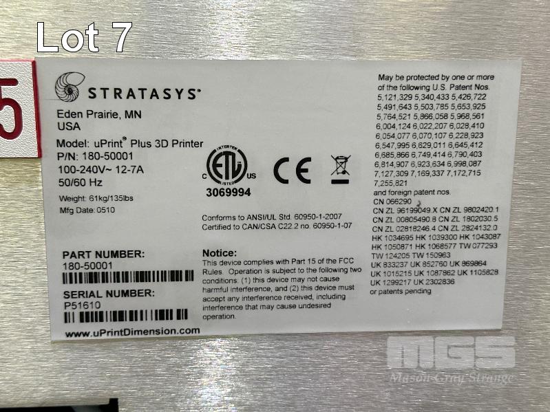 STRATASYS 3D PRINTER, MOD: UPRINTPLUS, P/N: 180-50001, SERIAL: P51610, DOM: 05/2010, 240V 10AMP, WITH ACCESSORIES + SCA CHRMICAL BATH, MOD: SCA-1200, SERIAL: 220-00437, 240V 10AMP
