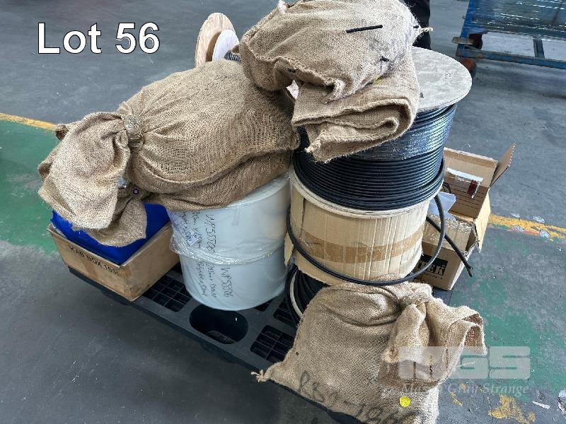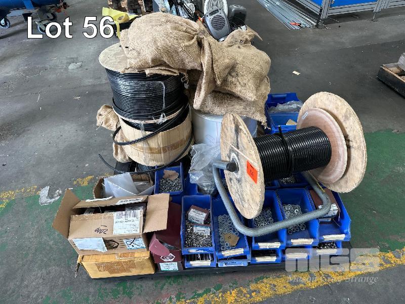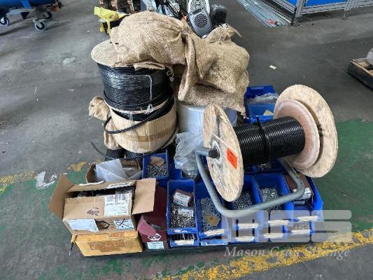 PALLET LOT, LARGE ANTENNA CABLE, HARDWARE, WASHERS, NUTS, BOLTS, ETC.