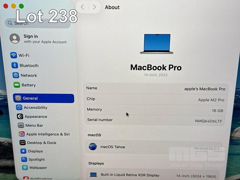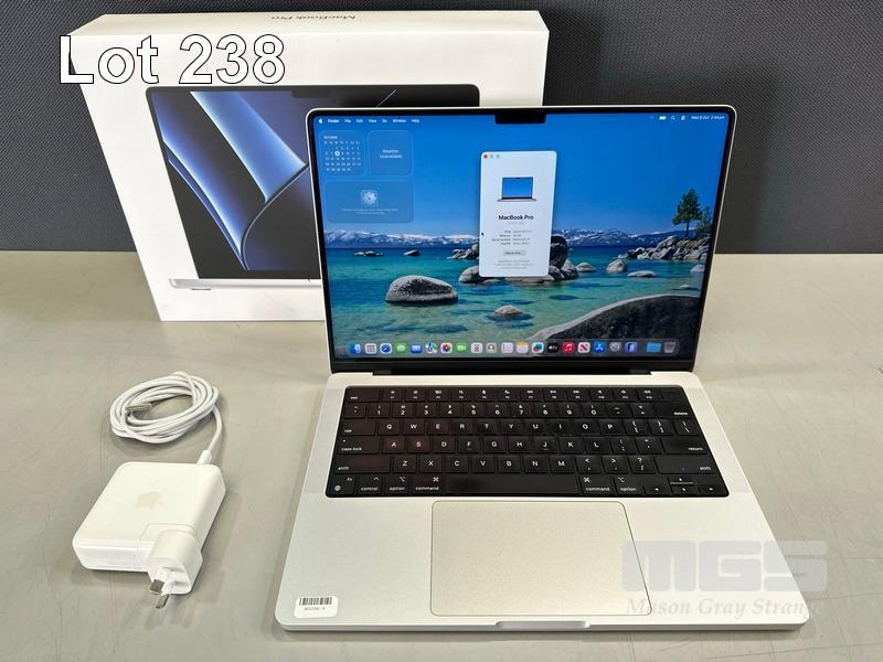 LAPTOP, APPLE MACBOOK PRO (A2779), MPHH3X/A, APPLE M2 PRO 10 CPU, 16 GPU, 16GB RAM, 512GB SSD, 14" RETINA DISPLAY (3024x1964), Wi-Fi, BLUETOOTH, MAC OS 26 INSTALLED & POWER SUPPLY (NOTE: MINOR MARKS ON SCREEN) S/N:NMQ64D6LTF