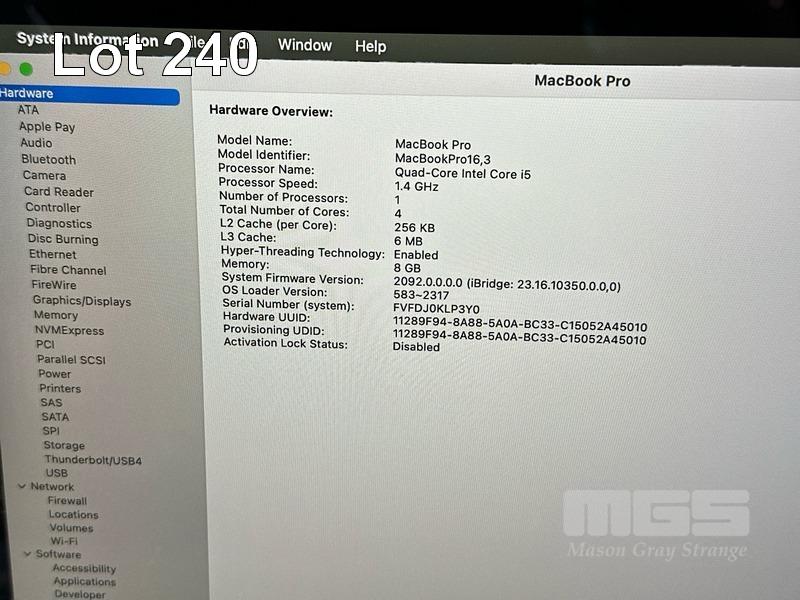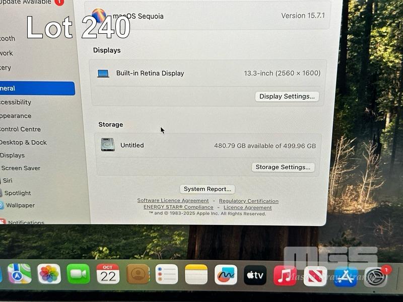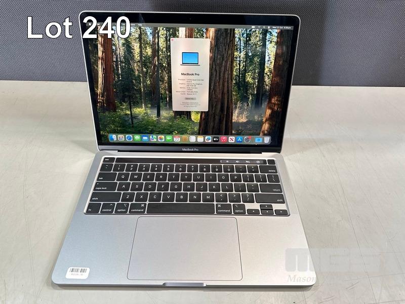 LAPTOP, APPLE MACBOOK PRO (A2289), CORE i5 8257U (8TH GEN) @ 1.4GHz, 8GB DDR3 RAM, 512GB SSD, 13.3" RETINA DISPLAY (2560x1600), INTEL IRIS PLUS GRAPHICS 645, Wi-Fi, BLUETOOTH, MAC OS 15 INSTALLED (NO USB-C POWER SUPPLY) (NOTE: SMALL SCRATCH ON SCREEN) S/N:FVFDJ0KLP3Y0