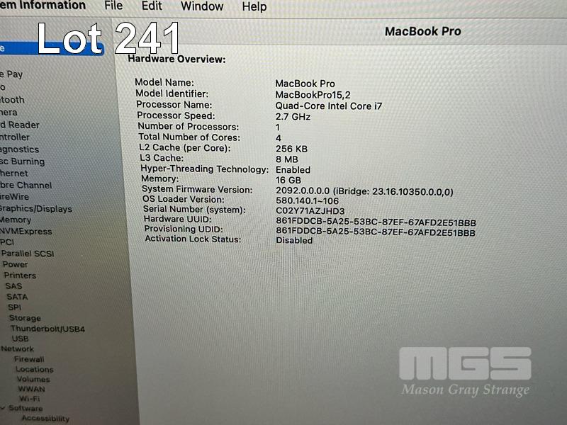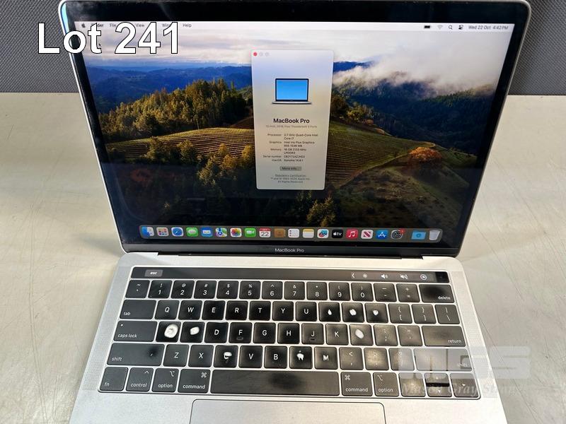 LAPTOP, APPLE MACBOOK PRO (A1989), CORE i7 8559U(8TH GEN) @ 2.7GHz, 16GB DDR3 RAM, 1TB SSD, 13.3" RETINA DISPLAY (2560x1600), INTEL IRIS PLUS GRAPHICS 655, Wi-Fi, BLUETOOTH, MAC OS 14 INSTALLED (NO USB-C POWER SUPPLY) (NOTE: SOME KEYS WORN ON KEYBOARD) S/N:C02Y71AZJHD3
