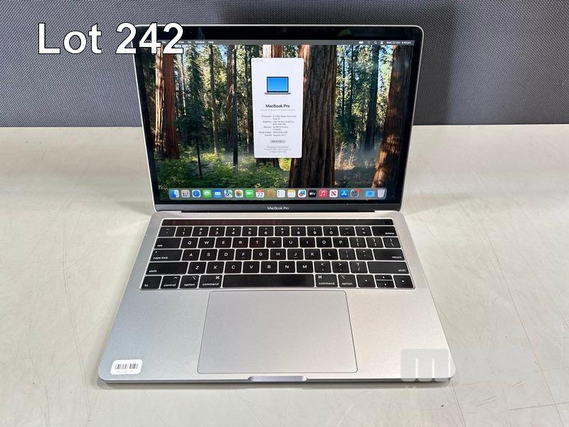 LAPTOP, APPLE MACBOOK PRO (A1989), CORE i5 8279U (8TH GEN) @ 2.4GHz, 16GB DDR3 RAM, 2TB SSD, 13.3" RETINA DISPLAY (2560x1600), INTEL IRIS PLUS GRAPHICS 655, Wi-Fi, BLUETOOTH, MAC OS 15 INSTALLED (NO USB-C POWER SUPPLY) (NOTE: SWOLLEN BATTERY, MINOR MARKS ON SCREEN) S/N:C02C325ELVDM
