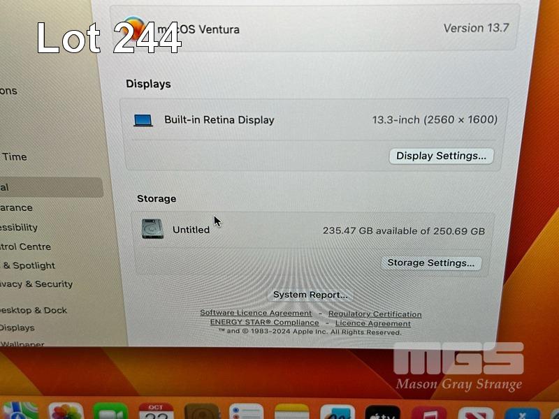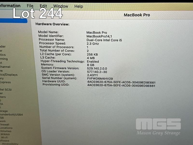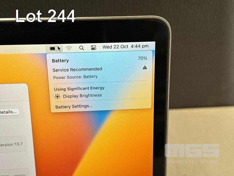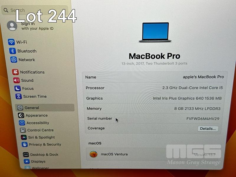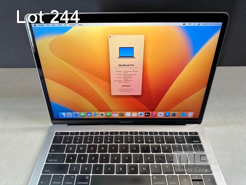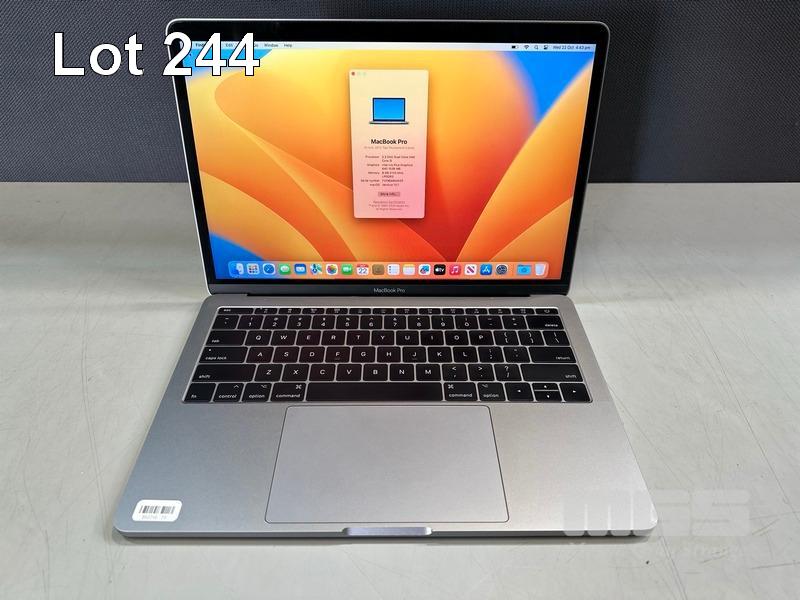 LAPTOP, APPLE MACBOOK PRO (A1708), CORE i5 7360U (7TH GEN) @ 2.3GHz, 8GB DDR3 RAM, 256GB SSD, 13.3" RETINA DISPLAY (2560x1600), INTEL IRIS PLUS GRAPHICS 640, Wi-Fi, BLUETOOTH, MAC OS 13 INSTALLED (NO USB-C POWER SUPPLY) (NOTE: BATTERY SERVICE RECOMMENDED MESSAGE, MINOR MARKS ON SCREEN) S/N:FVFWD6M4HV29