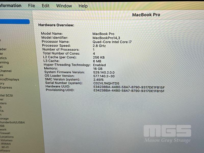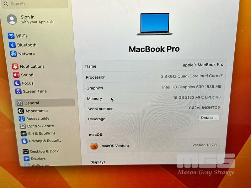 LAPTOP, APPLE MACBOOK PRO (A1707), CORE i7 7700HQ (7TH GEN) @ 2.8GHz, 16GB DDR3 RAM, 256GB SSD, 15.4" RETINA DISPLAY (2880x1800), INTEL HD GRAPHICS 630, 2GB RADEON PRO 555 VIDEO, Wi-Fi, BLUETOOTH, MAC OS 13 INSTALLED (NO USB-C POWER SUPPLY) (NOTE: 1 x KEY WORN ON KEYBOARD, MARKS ON SCREEN) S/N:C02VL1NQHTD5