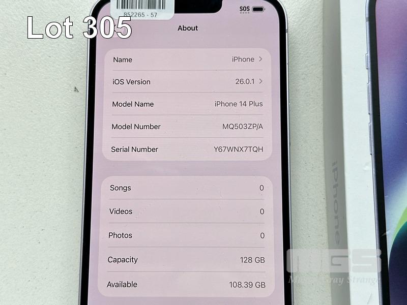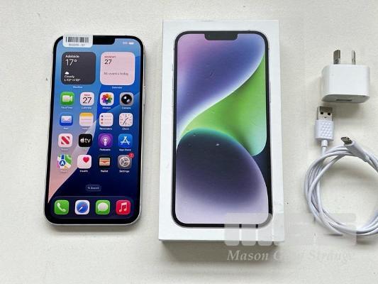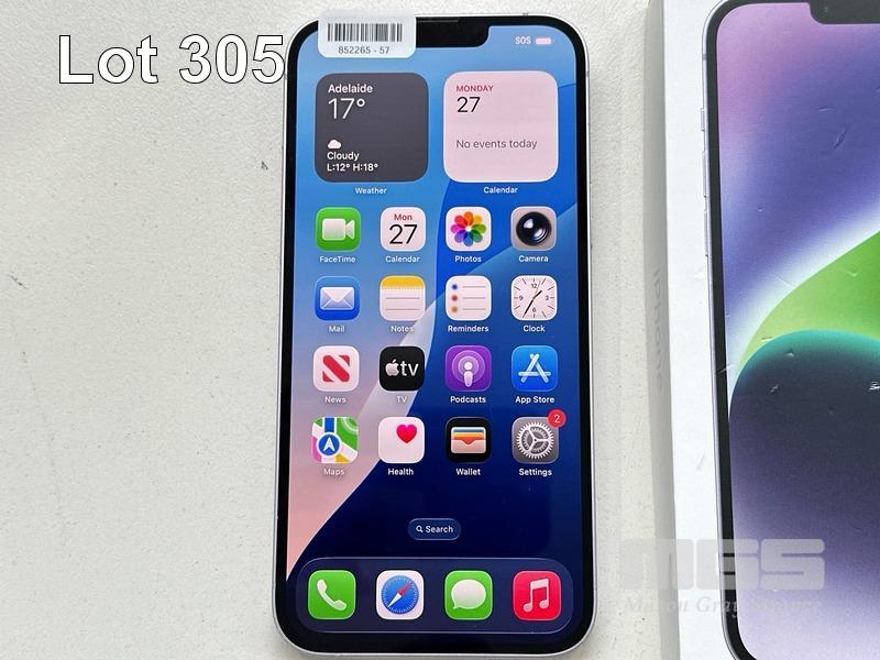 APPLE iPHONE 14 PLUS, 128GB, PURPLE, MODEL MQ503ZP/A, A2886, BATTERY HEALTH 87% WITH CABLE & CHARGER (NOTE: DAMAGE ON BACK, MINOR SCRATCHES ON SCREEN) S/N:Y67WNX7TQH
